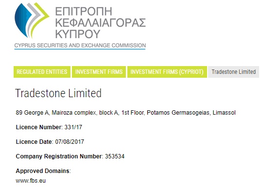 FBS is a brand name used by the Tradestone Limited, which is a Cyprus registered company, EU and MiFID regulated investment firm registered with CySEC. Additional entity of FBS is located in the Marshall Islands and Belize, which are offshore zones that do not really prove its reliable status on its own. Yet, together with regulation from European CySEC it makes FBS a broker which compliant to regulatory requirements and therefore offers reliable trading conditions.