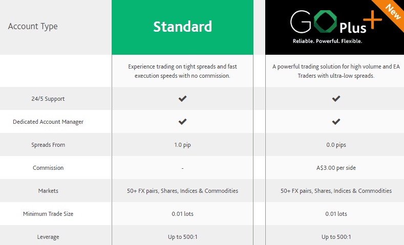 The broker offers two account types Standard and GO Plus Accounts with the flexibility to manage the trading way and choose the best fit. So there is an option between Standard trading proposal based on spread charges via GO Plus+ specifically designed through light-fast technology.